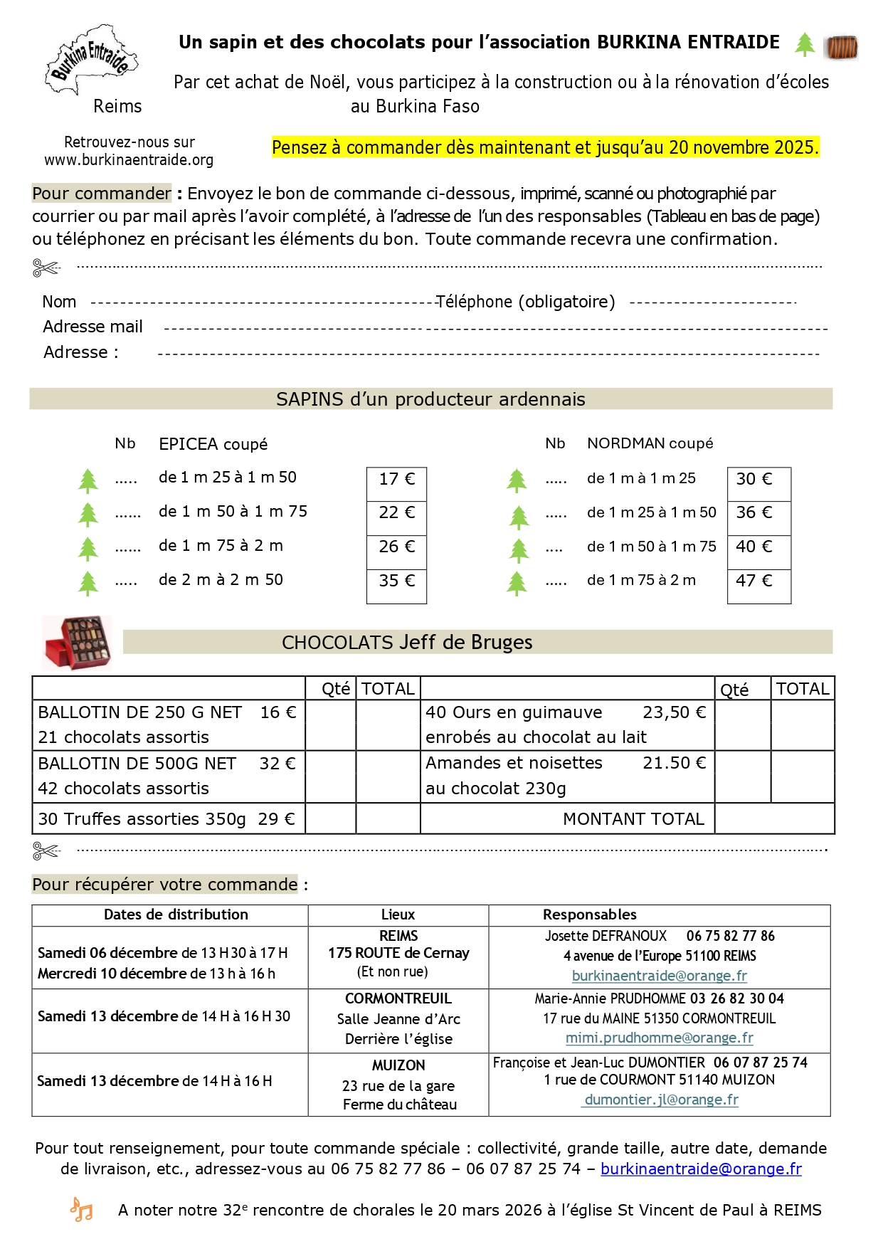 Les épicéas et les Nordmann sont achetés chez un producteur ardennais. Si vous souhaitez une taille différente de celles proposées, contactez- nous par téléphone  : 06 75 82 77 86  ou  06 07 87 25 74,  ou par mail  : burkinaentraide@orange.fr